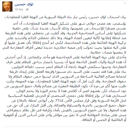 أعلن رئيس تيار بناء الدولة السورية «لؤي حسين»، مساء أمس الثلاثاء، إنسحابه من عضوية «الهيئة العليا للمفاوضات»، المنبثقة عن مؤتمر الرياض، والمزمع عقد أولى جلساتها التفاوضية في 25 الشهر الحالي.