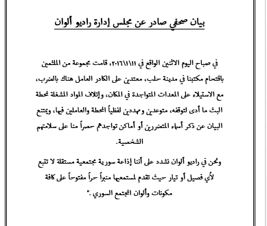 بيان صحفي صادر عن راديو ألوان حول اقتحام مكتبه في حلب