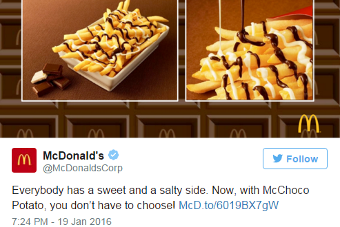 سلسلة مطاعم الوجبات السريعة الأميركية الشهيرة وصفت البطاطس المقلية بالشوكولاته بـ “الابتكار المفاجئ والفريد” الذي يتجاوز كل التوقعات، والذي فضلت تجربته لدى الجمهور في فروعها باليابان، كما حدث في السابق مع بطاطس Shaka Shaka المقلية والمغطاة بالجبن واللحم المقدد، بحسب الموقع الرسمي لماكدونالدز.