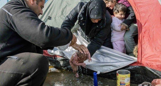 صورة نشرتها “الديلي ميل” لمولد سوري في مخيم مؤقت للاجئين بـ اليونان.