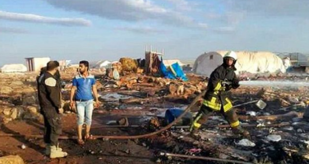 وتظهر صور نُشرت على وسائل التواصل الاجتماعي خياماً محترقة في المخيم، قرب سرمدا في إدلب.