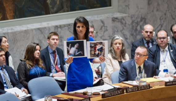 وصفت المندوبة الدائمة للولايات المتحدة في الأمم المتحدة نيكي هايلي الهجوم الكيميائي على خان شيخون “بانحطاط يفوق أي انحطاط سابق حتى بالنسبة إلى نظام الأسد البربري”.