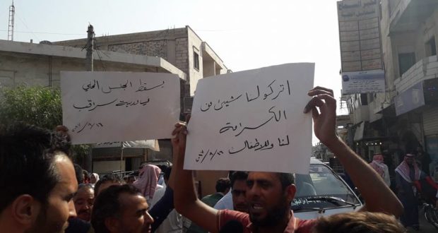وفي سراقب، خرج عددٌ من المدنيّين، صباحَ اليوم السبت، في مظاهرةٍ تدعو إلى “إسقاط المجلس المحلي”، بعد البدء بتنفيذ قراراتٍ صادرة عنه؛ تقضي بإزالة البسطات من طرقات المدينة.