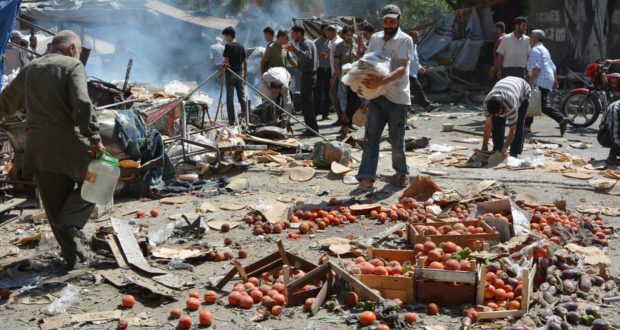 قُتِلَ مدنيّان وجرح آخرون، بغاراتٍ شنّتها طائرات النظام، صباح اليوم الثلاثاء، على سوقٍ للخضار في مدينة أريحا جنوب غربي إدلب، تزامناً مع مقتل مدنيّين إثنين وجرح 6 آخرين، بقصفٍ مماثل استهدف بلدة السكرية في ريف المحافظة الغربي.